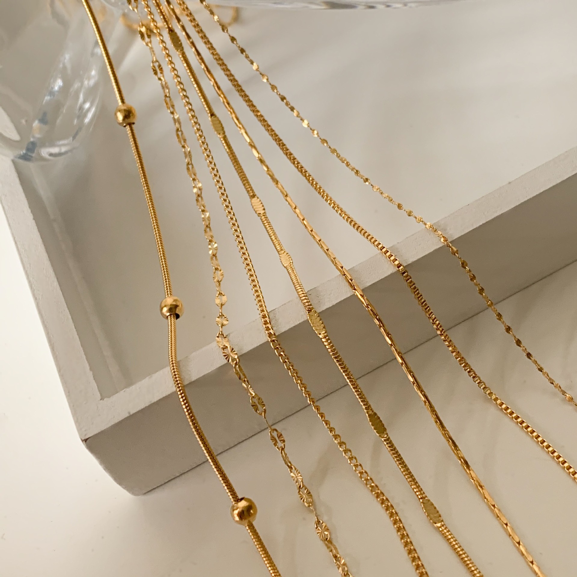 模板名称: 十字链盒子链蛇骨链压花链项链满天星钛钢镀24K金色太阳花锁骨链