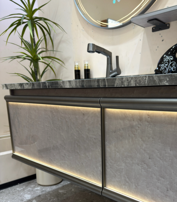 进口高光门板.边缘搭配金属质感的饰条,嵌入柔和的灯带,既提升了氛围感又增加了夜间的安全性!